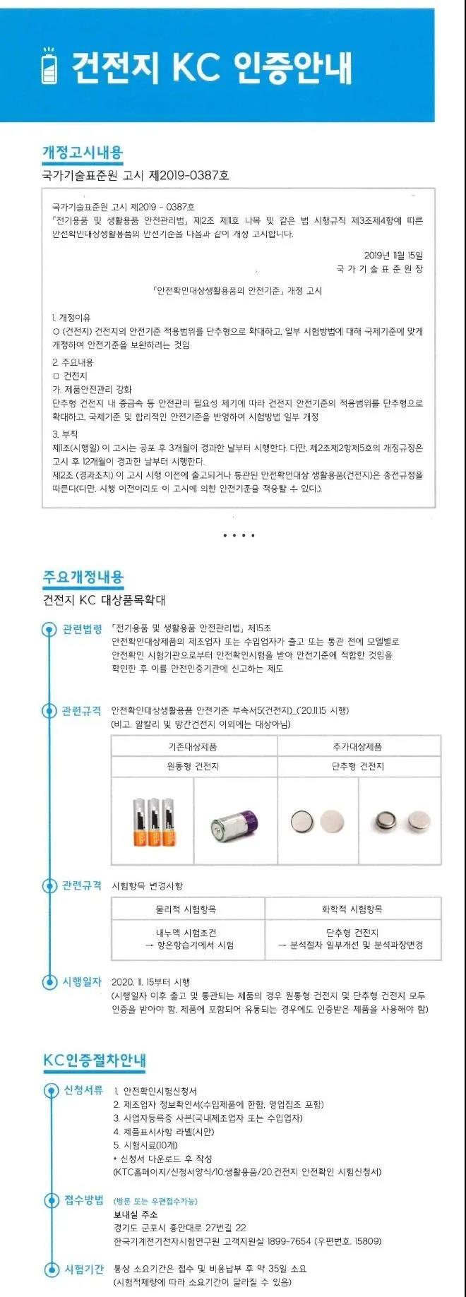 近日,韓國修訂了《電器及家居用品安全管理法》,首次將紐扣干電池列入KC認證管控范圍,該項規(guī)定從2020年11月15日開始生效,其管制范圍包括圓柱形電池和紐扣電池,同時如果終端產(chǎn)品內(nèi)含有圓柱形電池以及紐扣電池,其使用的電池也必須經(jīng)過KC認證后,方可進入韓國市場售賣。